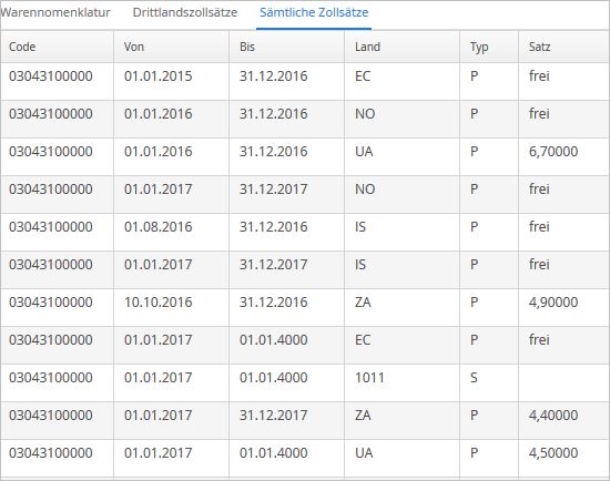 Standardmäßig werden zunächst die Datensätze der Nomeklaturhistorie angezeigt; die Aktivierung der beiden nachfolgenden Reiter führt zur Anzeige der Drittlandszollsätze oder aller Zollsätze abhängig von den Parametern in der Kopfleiste.